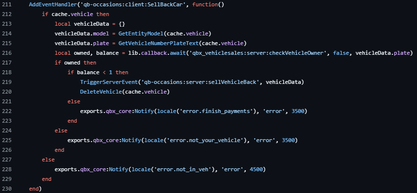 exports.qbx_core:Notify(source, "You cannot sell a vehicle that is under finance", 'error')